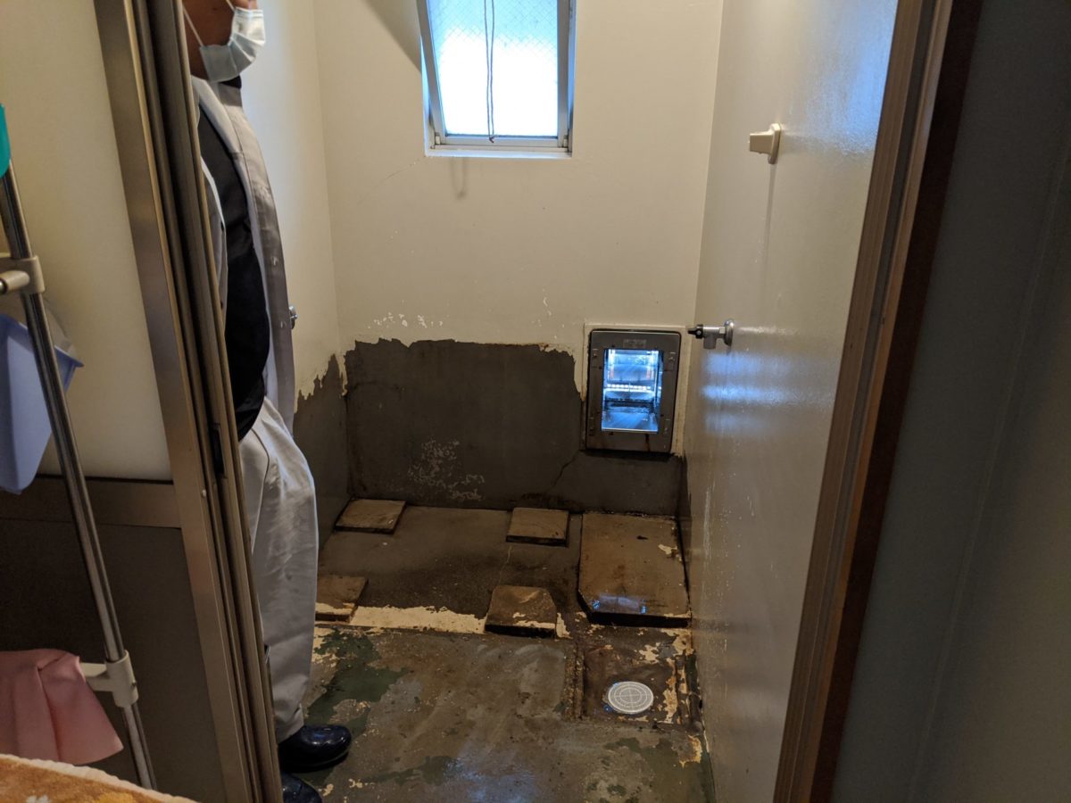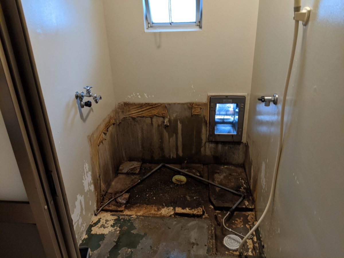 バランス釜と浴槽を撤去したら、浴槽の下にたまった長年の汚れをきれいに洗います。